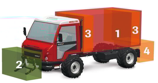 Das Fahrgestell der Reform Muli ist auf Vielseitigkeit getrimmt. Es stehen 4 vollwertige Anbauräume für eine Vielzahl von Anbaugeräten aufgesattelt, oder über 3 - Punktanbau zur